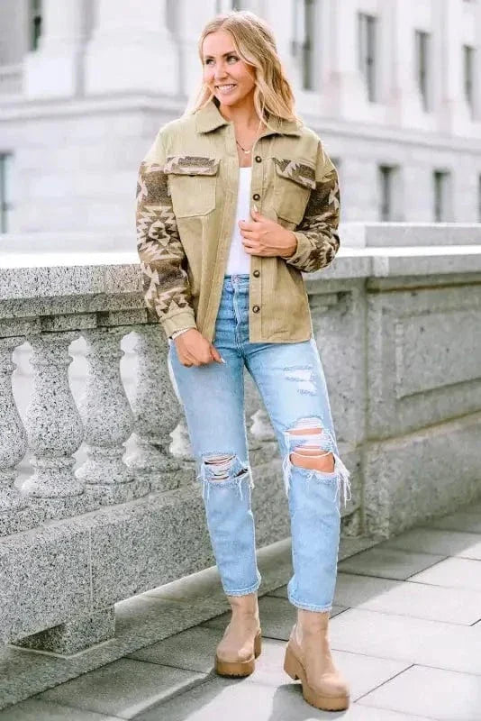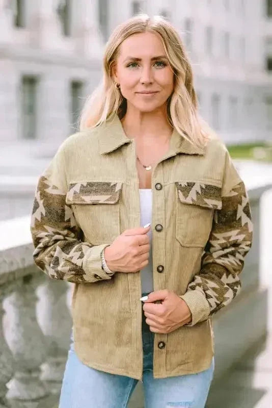 Western Corduroy Jacket - Khaki Aztec Patchwork